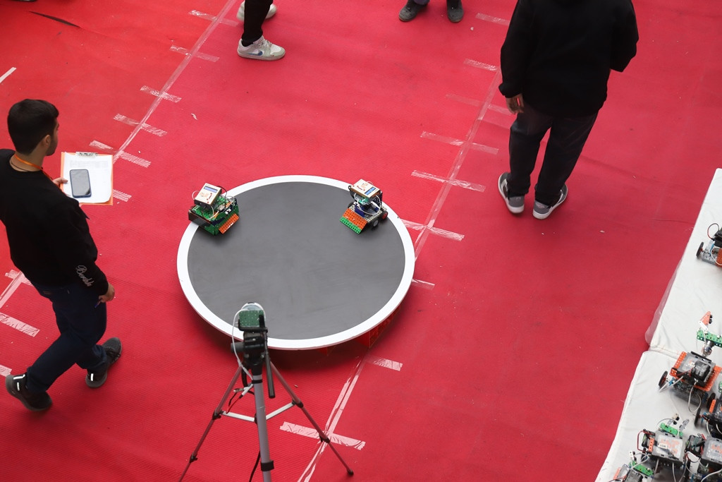 The competition arena is a black circular field with a diameter of 120 centimeters, creating a compact, high‑intensity environment that tests the robots’ speed, tactical design and real‑time decision‑making.