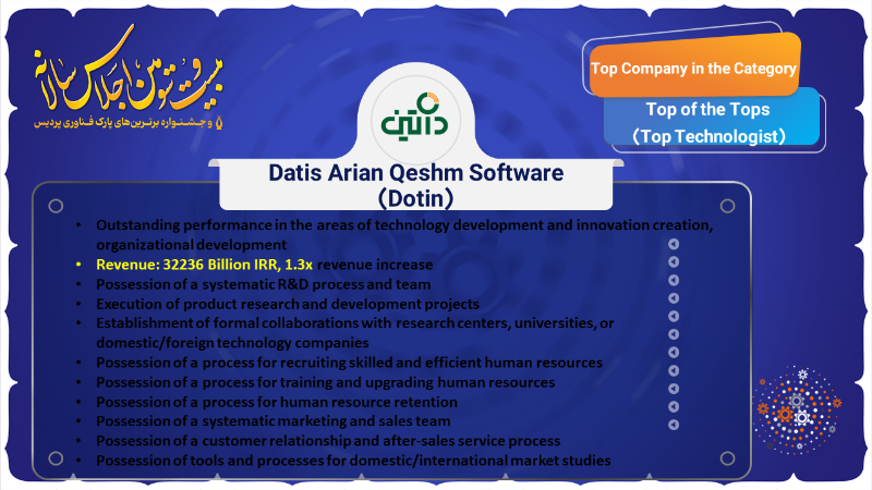 This year’s top innovation award went to Datis Aryan Qeshm (Dotin), a software company distinguished for its technology development and innovation efforts. Dotin’s achievements included a 1.3-fold revenue increase, an advanced R&D team, multiple new product development projects, and collaborations with domestic and international research and innovation centers.
