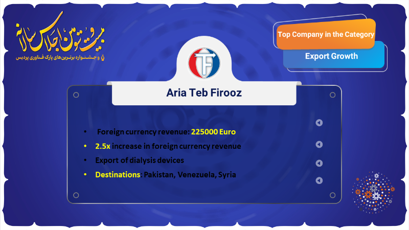 - Export Excellence Award – Arya Teb Firooz, producer of hemodialysis machines, doubled and a half its foreign currency revenues with exports to Pakistan, Venezuela, and Syria.