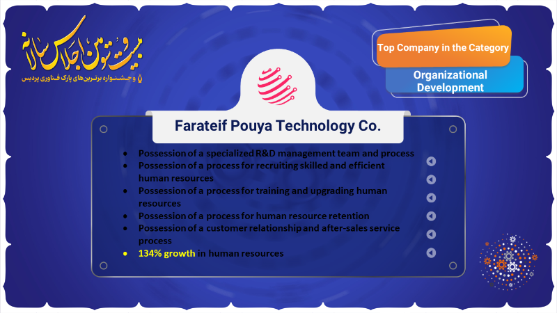 - Organizational Development Award – FaraTeif Pouya Technology Co. grew its workforce by 134% and strengthened HR systems, customer relations, and after-sales services.