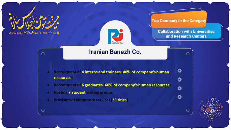 - University Collaboration Award – Iranian Banzh employed 40% of its staff from student interns and 60% from specialist graduates, hosting seven university visits and providing 35 lab and workshop services.
