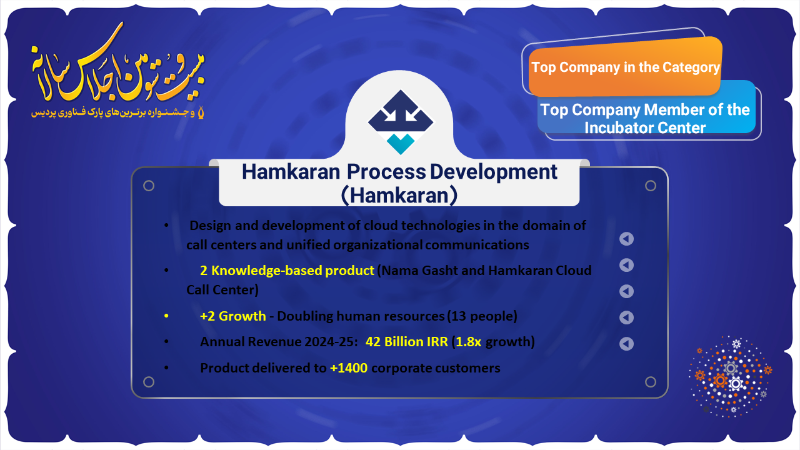 - Elite Technology Development Center Award – Hamkaran Process Development doubled its workforce, increased revenue by 80%, and supplied over 1,400 enterprise clients with advanced cloud-based contact center technologies.