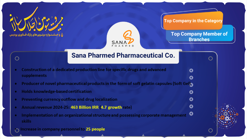 - Branch Excellence Award – Sana Pharmed Pharmaceutical Co. established a dedicated production line for advanced soft gel drugs, indigenized several specialty medicines, and achieved a 4.7-fold revenue increase.