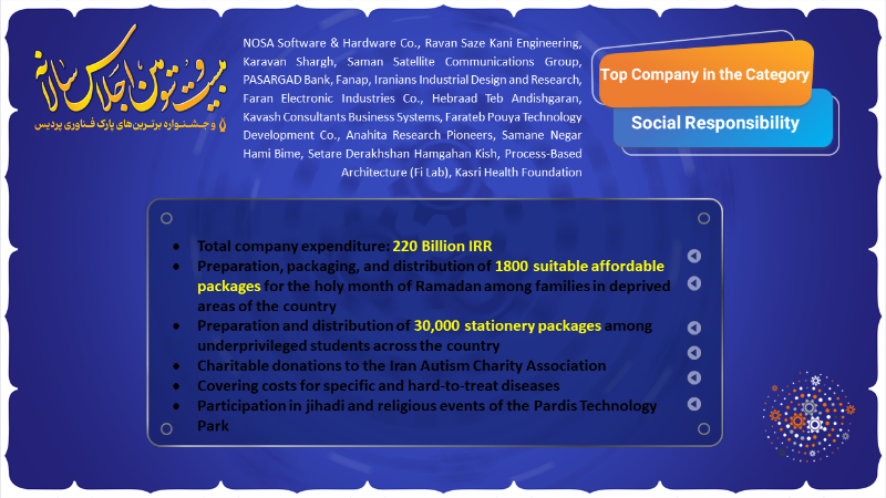 22 companies—including Nosa, Raven Sazeh, Kani Kavan Shargh, and FANAP—were honored for impactful CSR projects such as distributing 2,500 food packages during Ramadan, delivering 30,000 school supply kits to underprivileged students, covering treatment costs for patients with rare diseases, and supporting cultural and charity events.